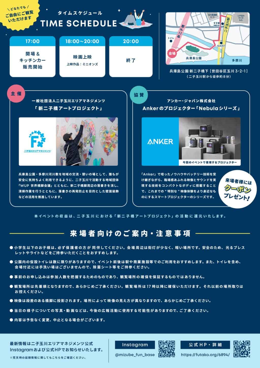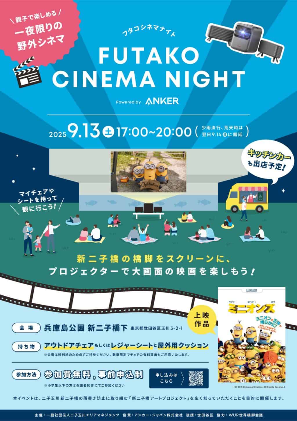 一般社団法人二子玉川エリアマネジメンツは、2025年9月13日(土)に多摩川河川敷にて、兵庫島公園内 新二子橋の橋脚を巨大スクリーンとする野外シネマイベント「FUTAKO CINEMA NIGHT powered by Anker」を開催し、137名の参加者とともに映画『ミニオンズ』を楽しみました。