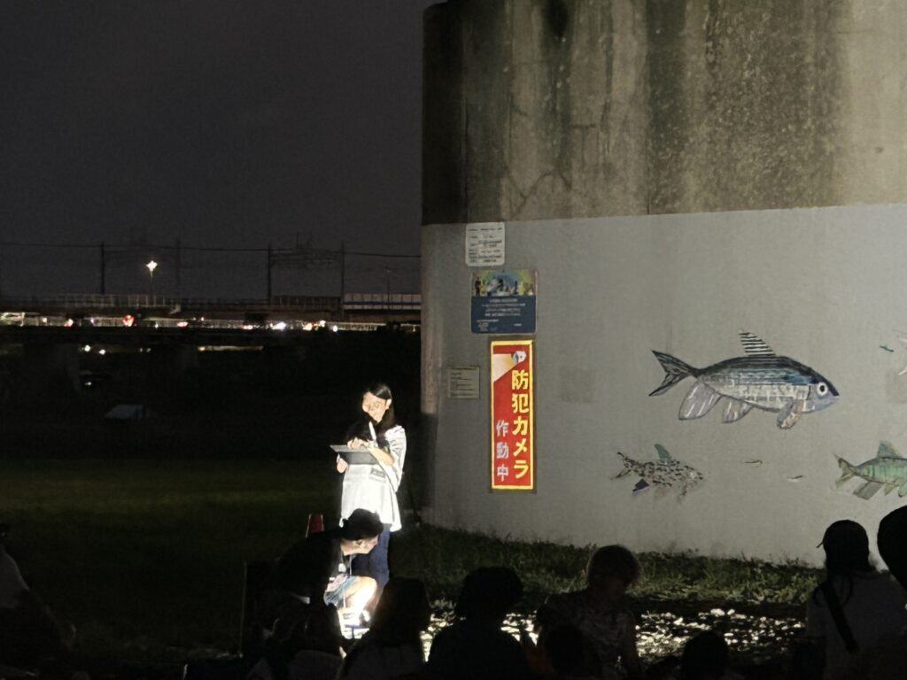 開会式は、当法人事務局長・内野のあいさつからスタートしました。当法人の活動紹介に加えて、本イベント誕生のきっかけは、落書き被害を受けた新二子橋の清掃作業を偶然手伝ってくださった親子との出会いであることを語りました。「思いがけない出会いから始まった取り組みが、今夜こうして皆様に楽しんでいただけることを嬉しく思います」と、感謝を込めてあいさつを締めくくりました。