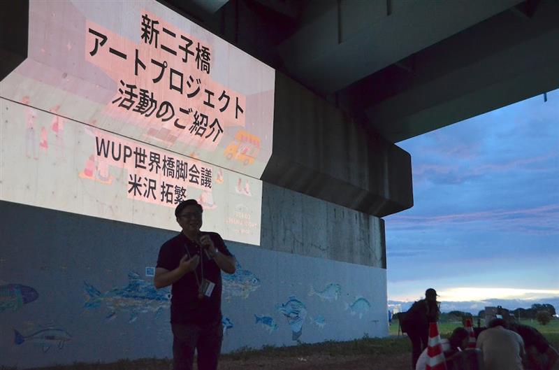 続いて、WUP世界橋脚会議の米沢氏より「新二子橋アートプロジェクト」の活動紹介が行われました。かつて落書きが目立っていた橋脚を「きれいにしたい」という有志の思いから始まったという経緯や、これまでの成果が語られ、今後も高架下をより素敵な空間にしていきたいという強い思いが伝えられました。参加者の方が「地域の橋脚を彩るアート」と「落書き防止」という活動に、熱心に耳を傾けてくださる場面も見られました。
